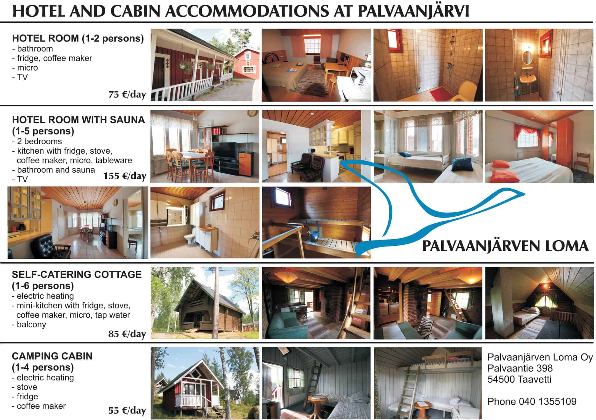 Accommodations in hotel room, self-catering cottage, camping cabin, tent or caravanning pitch
