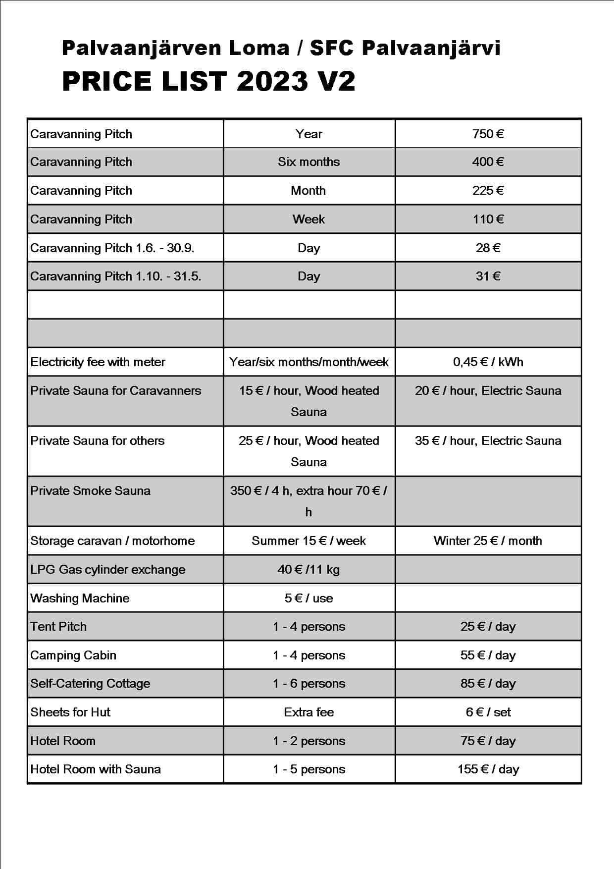 We have wood heated sauna and electric sauna. We also have a big smoke sauna. We have a nice restaurant Palvaa for 92 persons. During summer season there is also terrace for 100 persons. You can also rent a hut or hotel room from our resort village. Tent accommodation is also available. Caravanners have also lots of places to choose from.