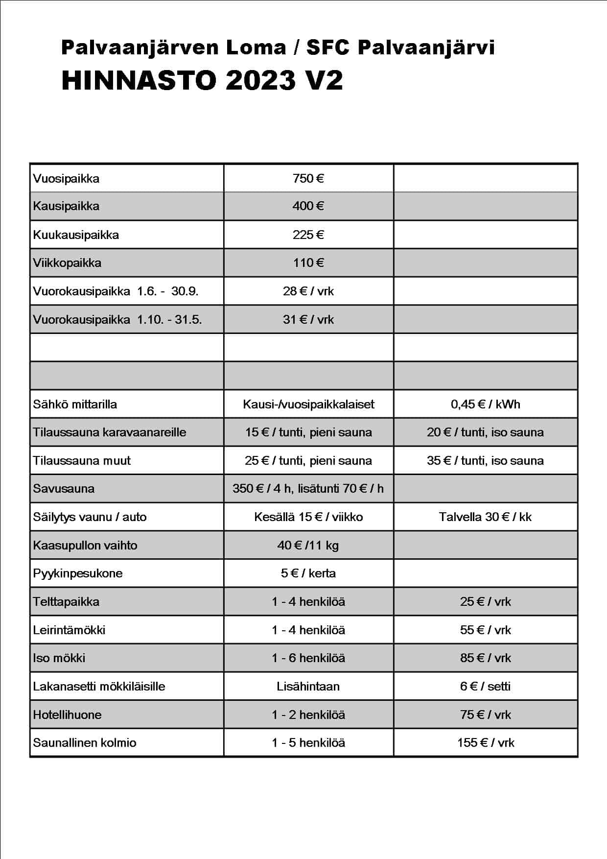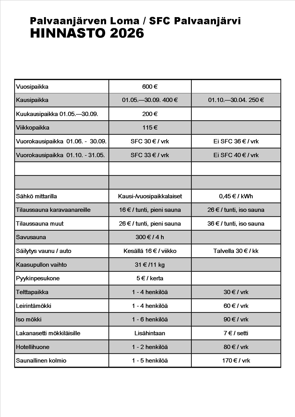 Majoitus- ja saunahinnasto