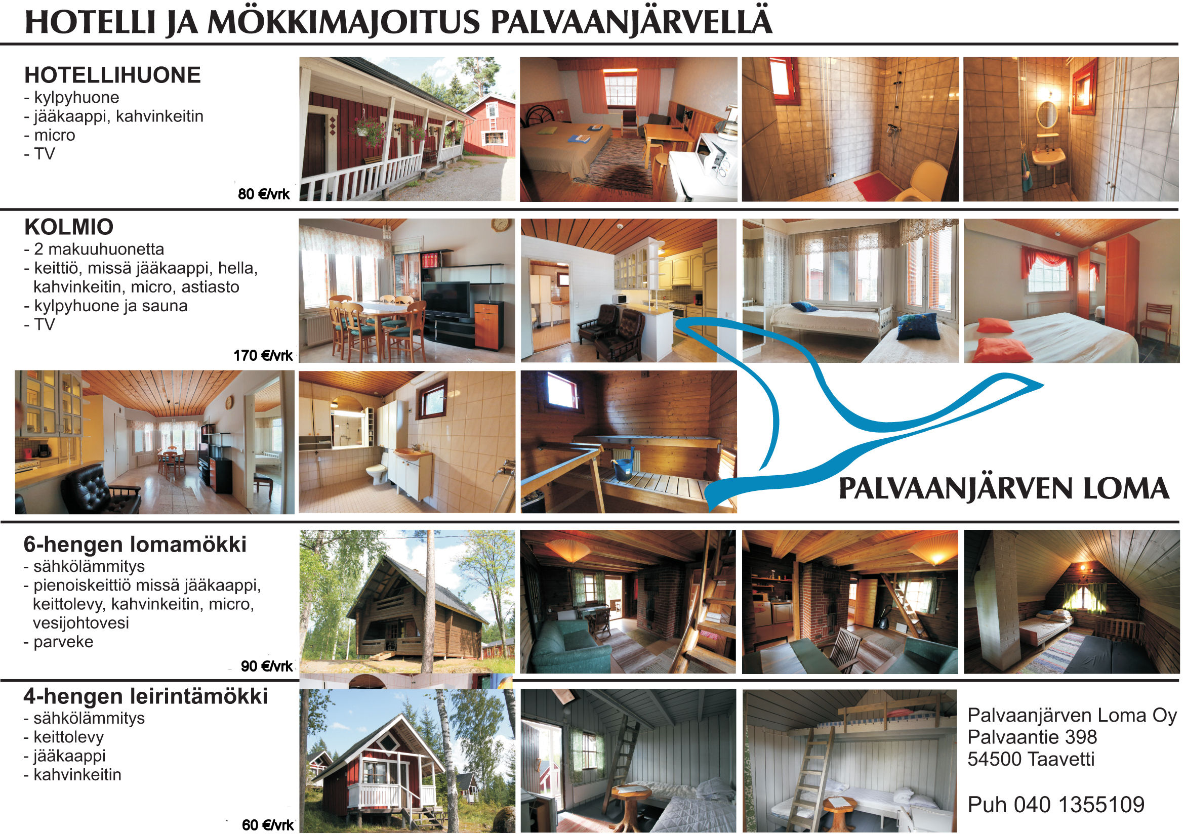 Hotellihuoneita, Saunallinen kolmio, 6-hengen lomamökki, 4-hengen leirintämökkejä ja tilaa 100:lle asuntovaunulle. Kolme erilaista rantasaunaa aivan veden äärellä.